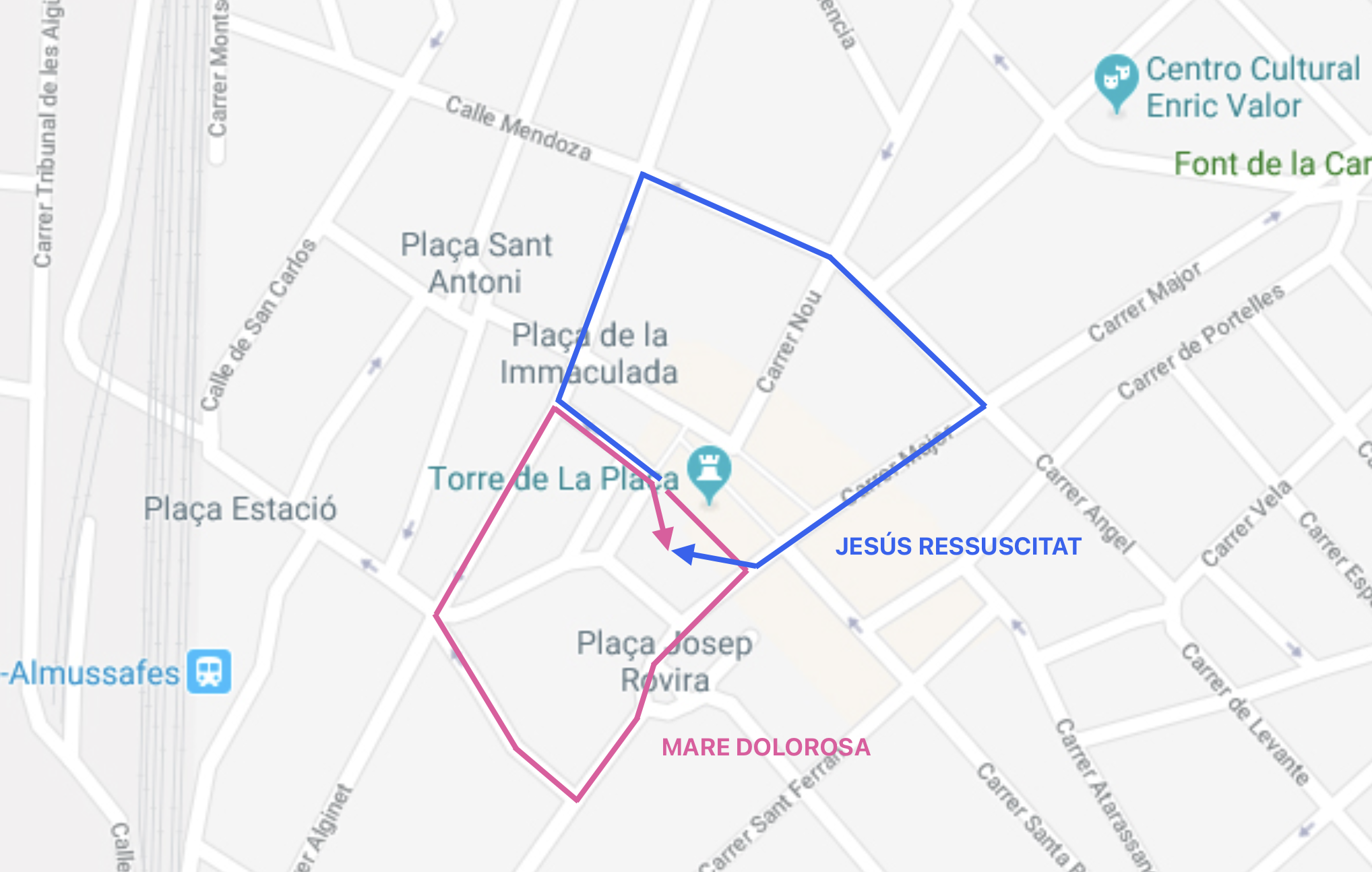 Mare de Deu: Carrer Major, Plaça José Rovira, Carrer Ermita, Carrer Francisco Morote, Carrer José Morote, Plaça Major